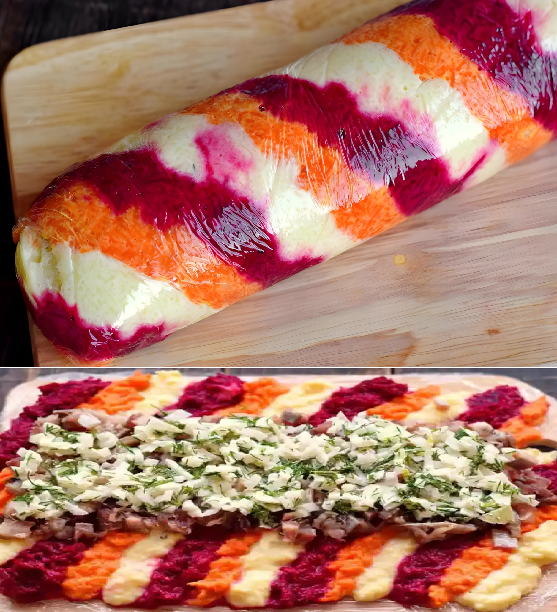 We bieden een ongewone portie van de beroemde « Shuba »-salade aan. De salade bestaat uit een drielaagse rol van groenten met een vulling van haring en uien. Om ervoor te zorgen dat de rol zijn vorm goed behoudt en niet uit elkaar valt, voegen we een beetje gelatine toe aan de groenten, waardoor de rol volledig geleivrij wordt. Deze rol is perfect voor speciale gelegenheden en ziet er prachtig en origineel uit op tafel.