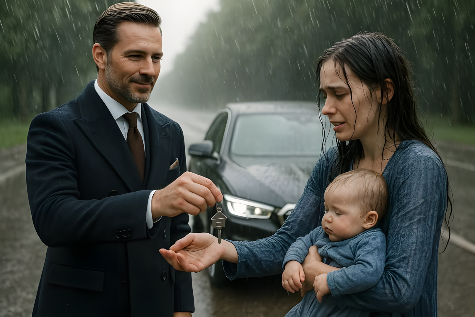 De regen begon plotseling – zware druppels vielen uit de lucht en veranderden de straten in kolkende beken. Martin Delacroix’ zwarte sedan sneed als een mes door de natte duisternis. Binnen – stilte. Leren stoelen, gedempte jazz, en Martin zelf, die zijn manchetten recht trok alsof de storm niets met hem te maken had.