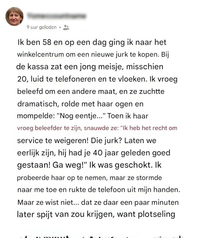 Toen ik vroeg of de jurk in mijn maat verkrijgbaar was, rolde ze met haar ogen, beëindigde haar gesprek en mompelde: « Nog eentje. »