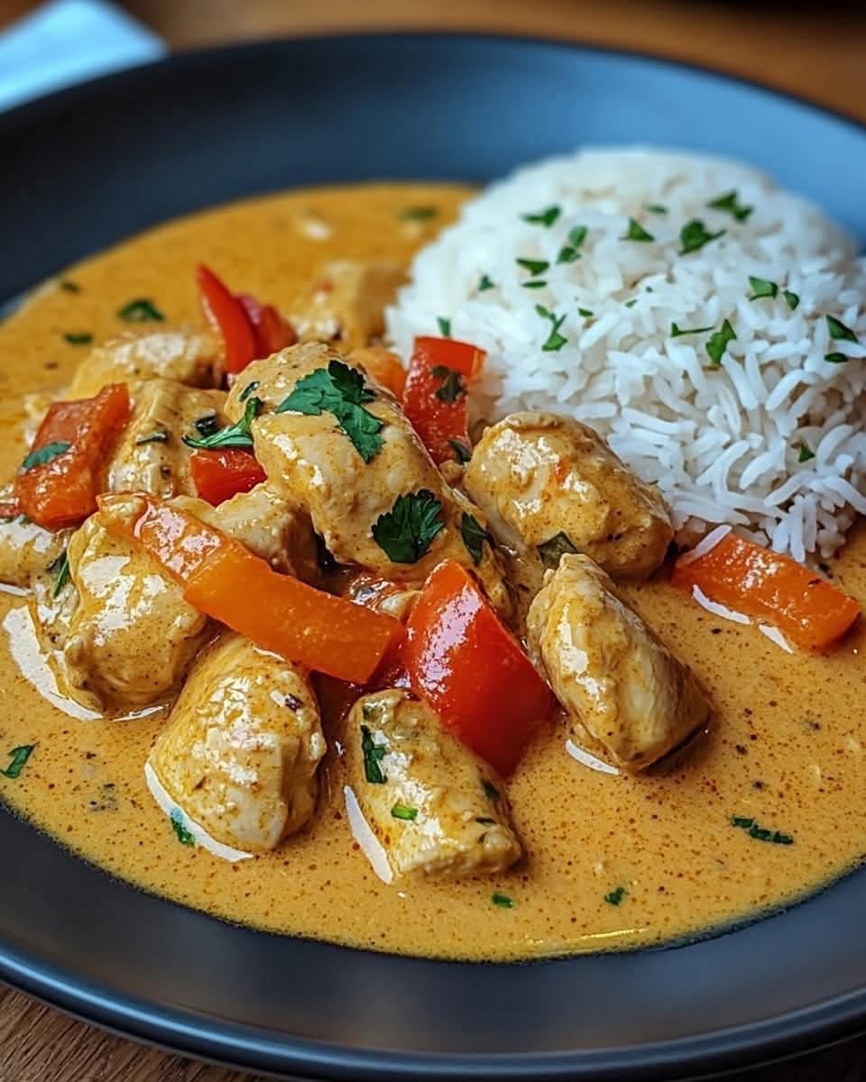 Deze romige kipcurry is een heerlijk en smaakvol gerecht dat malse kip, felgekleurde paprika’s en aromatische kruiden combineert in een zijdezachte kokosmelksaus. Geserveerd met luchtige basmatirijst is het een stevige maaltijd die zowel eenvoudig te maken is als boordevol krachtige, bevredigende smaken.