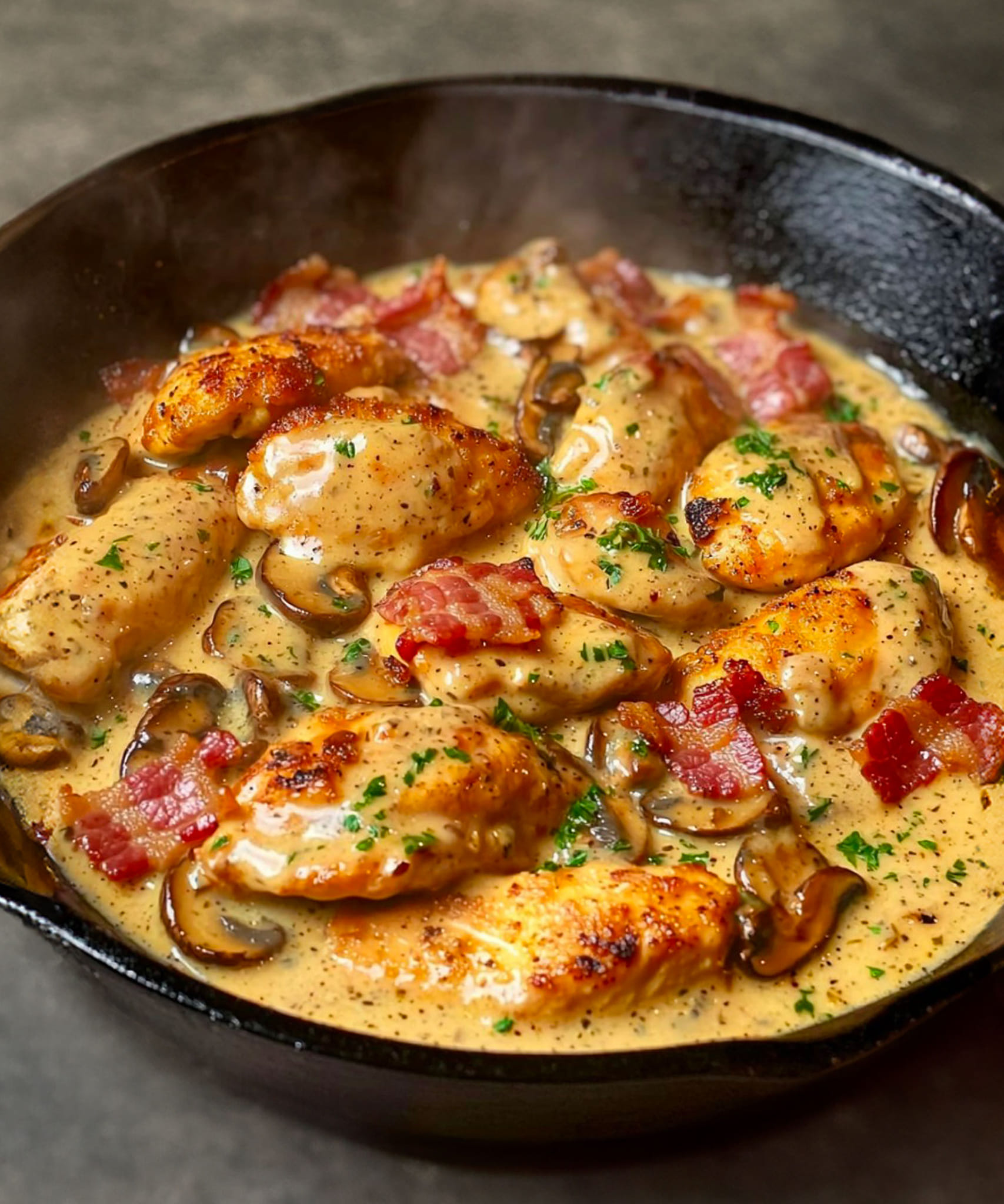 Er zijn gerechten die je direct op je gemak stellen, en deze kipreepjes met mosterd, spek en champignons zijn daar zeker een van. Met zijn romige en geurige saus verleidt dit eenvoudige maar verfijnde gerecht met de perfecte balans tussen de malsheid van de kip, de rokerige smaak van het spek en de smeltende textuur van de champignons. Of het nu voor een familielunch of een gezellig diner is, dit recept is perfect voor elke gelegenheid en brengt warmte en verwennerij aan tafel.