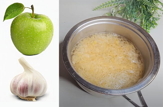 - Doe de geraspte knoflook en appel in een pan en voeg 1/2 liter kokend water toe. Goed mengen en 30 minuten laten staan.