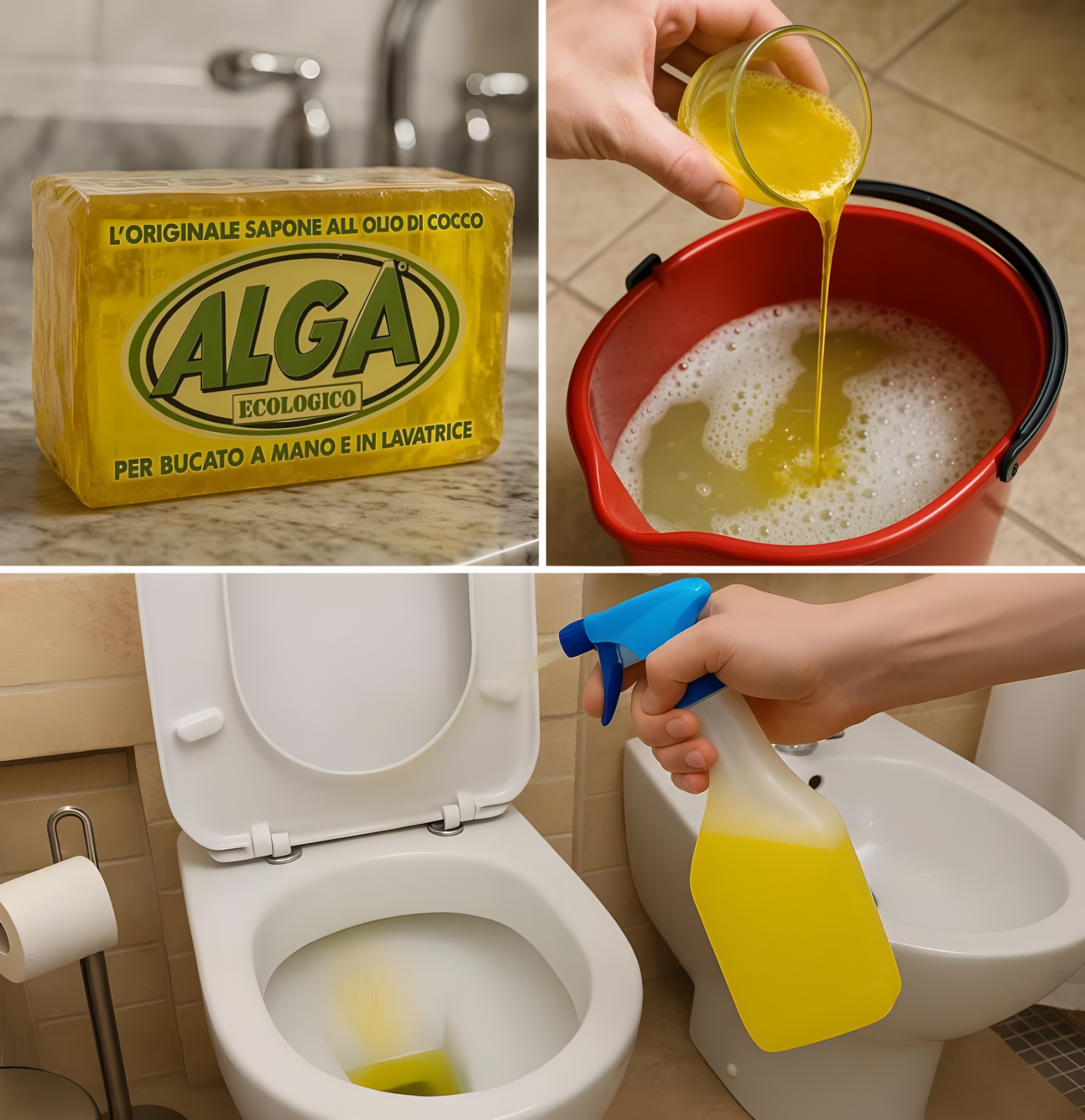 Gele zeep  is gemaakt van kokosolie  en is te koop in supermarkten, bijna altijd onder het merk « Alga ». Het is heel goedkoop en, zoals u zult zien, een uiterst veelzijdig en nuttig product voor huishoudelijke klusjes.