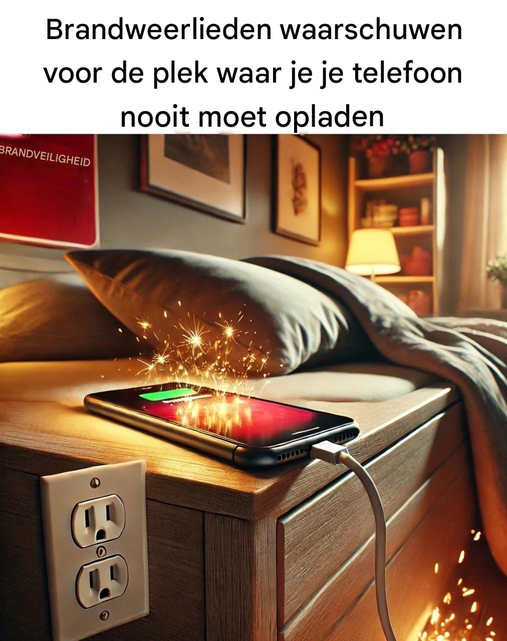 Brandweerlieden hebben één bijzonder gevaarlijke plek geïdentificeerd voor het opladen van telefoons: onder een kussen of op bed. Het opladen van een telefoon in bed, vooral onder een kussen, kan warmte vasthouden en goede ventilatie verhinderen, wat leidt tot oververhitting. De combinatie van hitte, brandbaar beddengoed en langdurig opladen kan een ideale bron van brandgevaar vormen. Deze praktijk komt vooral veel voor bij tieners en jongvolwassenen die hun telefoon ‘s nachts opladen terwijl ze slapen.
