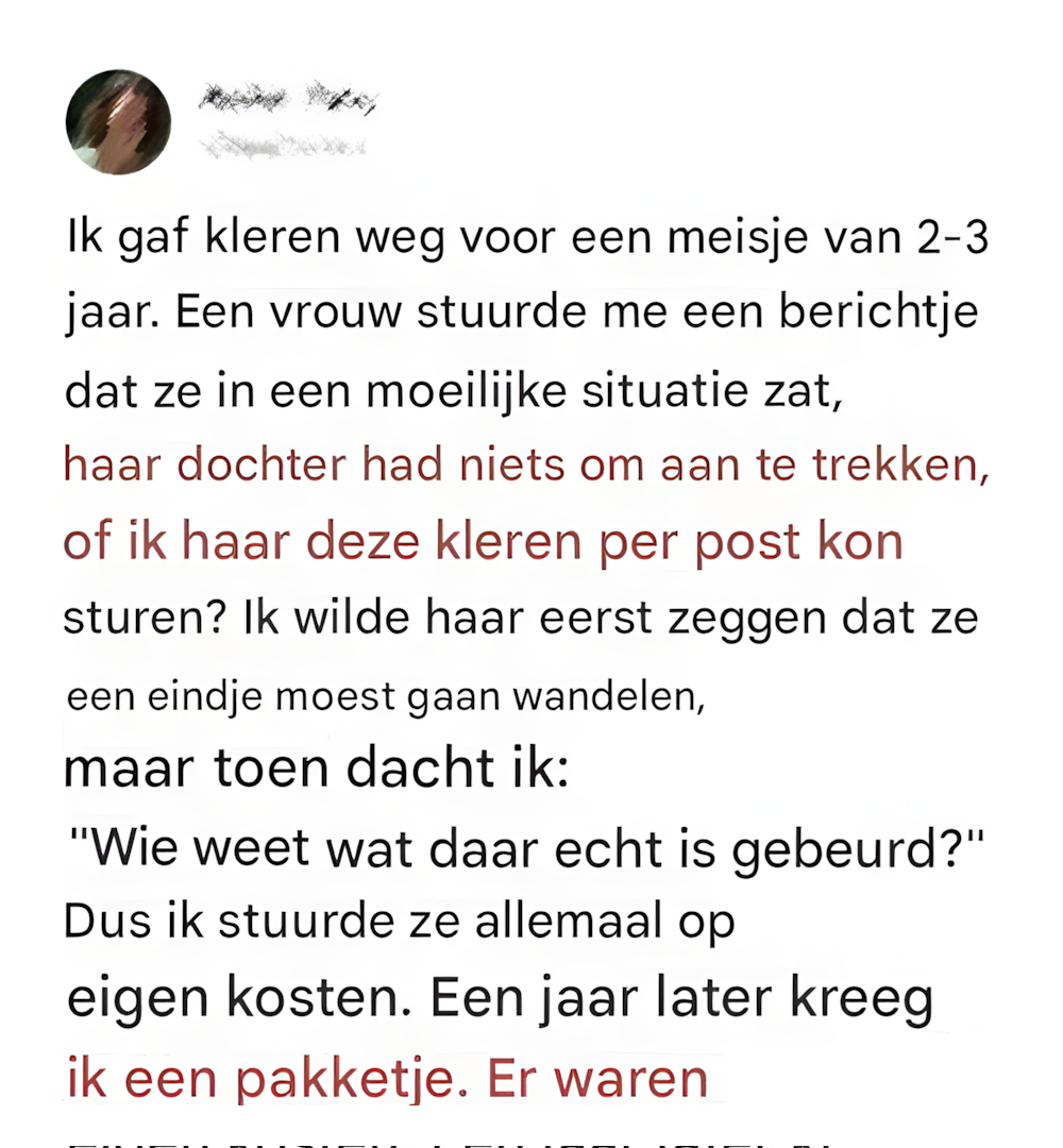 Vorig jaar, toen ik de kledingkast van mijn dochter aan het opruimen was, besloot ik om een aantal nauwelijks gedragen kledingstukken weg te geven aan een meisje van ongeveer 2 à 3 jaar oud.