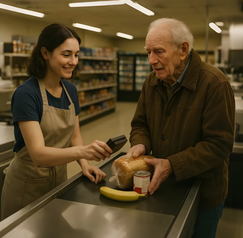 Zijn kleren waren versleten, zijn schoenen afgedragen, en zijn handen trilden licht toen hij een paar artikelen op de lopende band legde: een brood, een blik soep, een klein pak melk en een banaan.