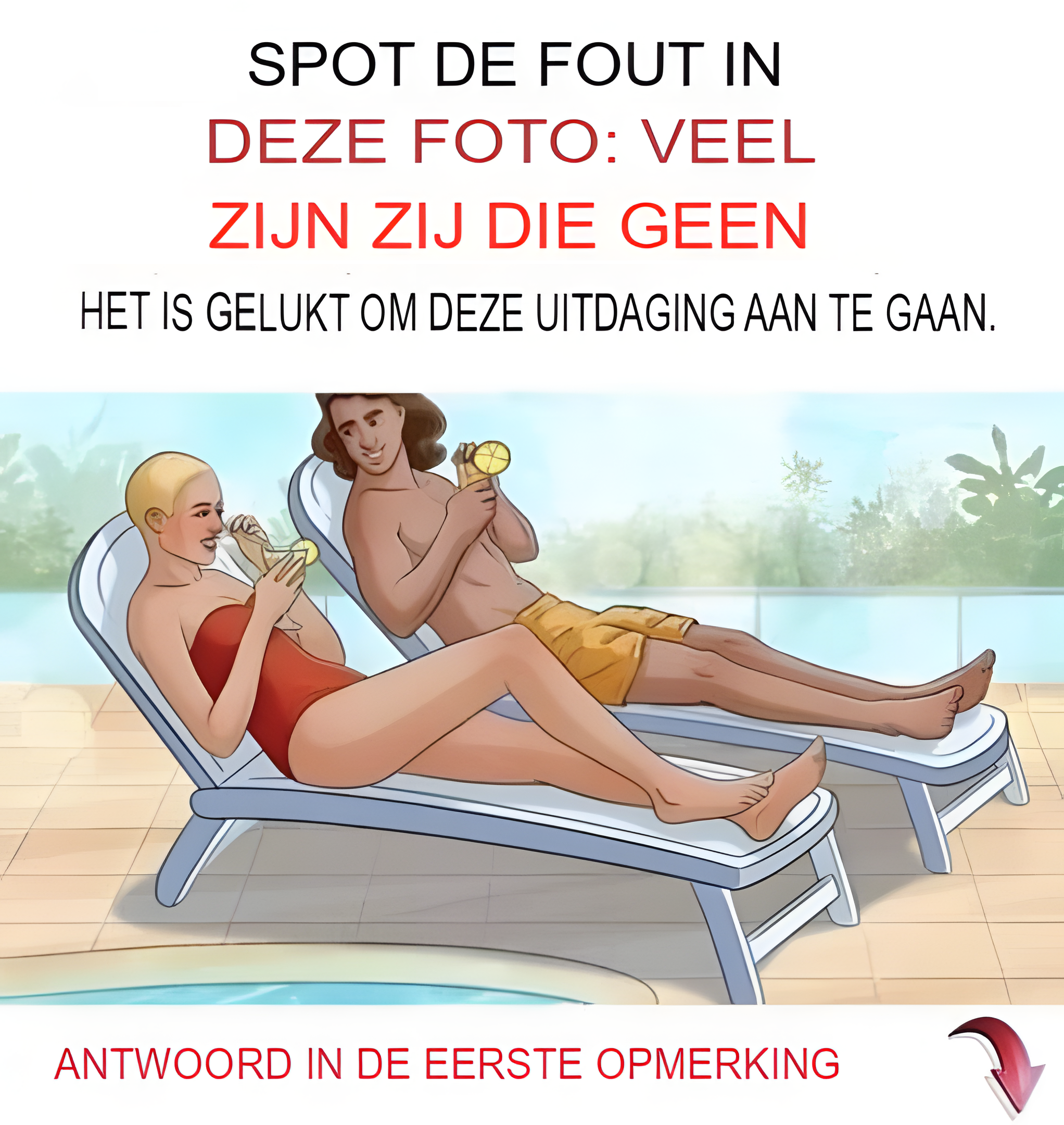 Stel je een prachtige zonnige dag voor: een stel zit bij het zwembad en drinkt cocktails. Op het eerste gezicht lijkt alles perfect. Maar wees voorzichtig, want dit idyllische tafereel verbergt een vergissing. Kun jij het binnen 10 seconden detecteren?