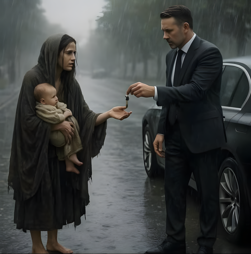Een miljonair op weg naar het vliegveld ziet een bedelares met een kind in de regen en geeft haar de sleutels van zijn huis!