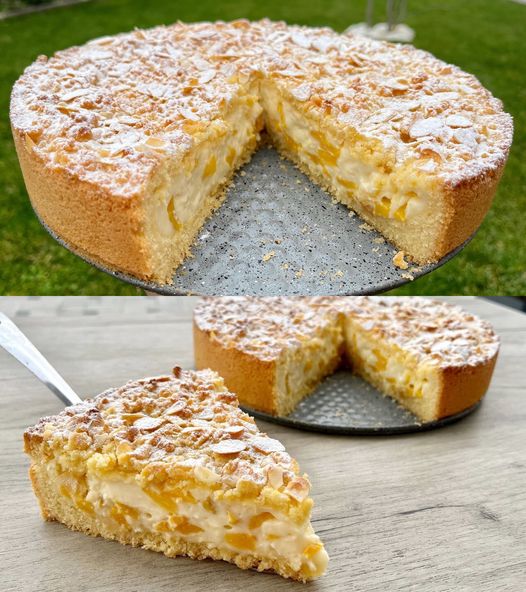 Deze cake combineert een zanddeegachtige bodem, een romige banketbakkersroomvulling met stukjes perzik en een verrassend krokante topping van geraspt deeg en amandelen. Een waar paradijs voor de smaakpapillen die je doet verlangen naar meer!