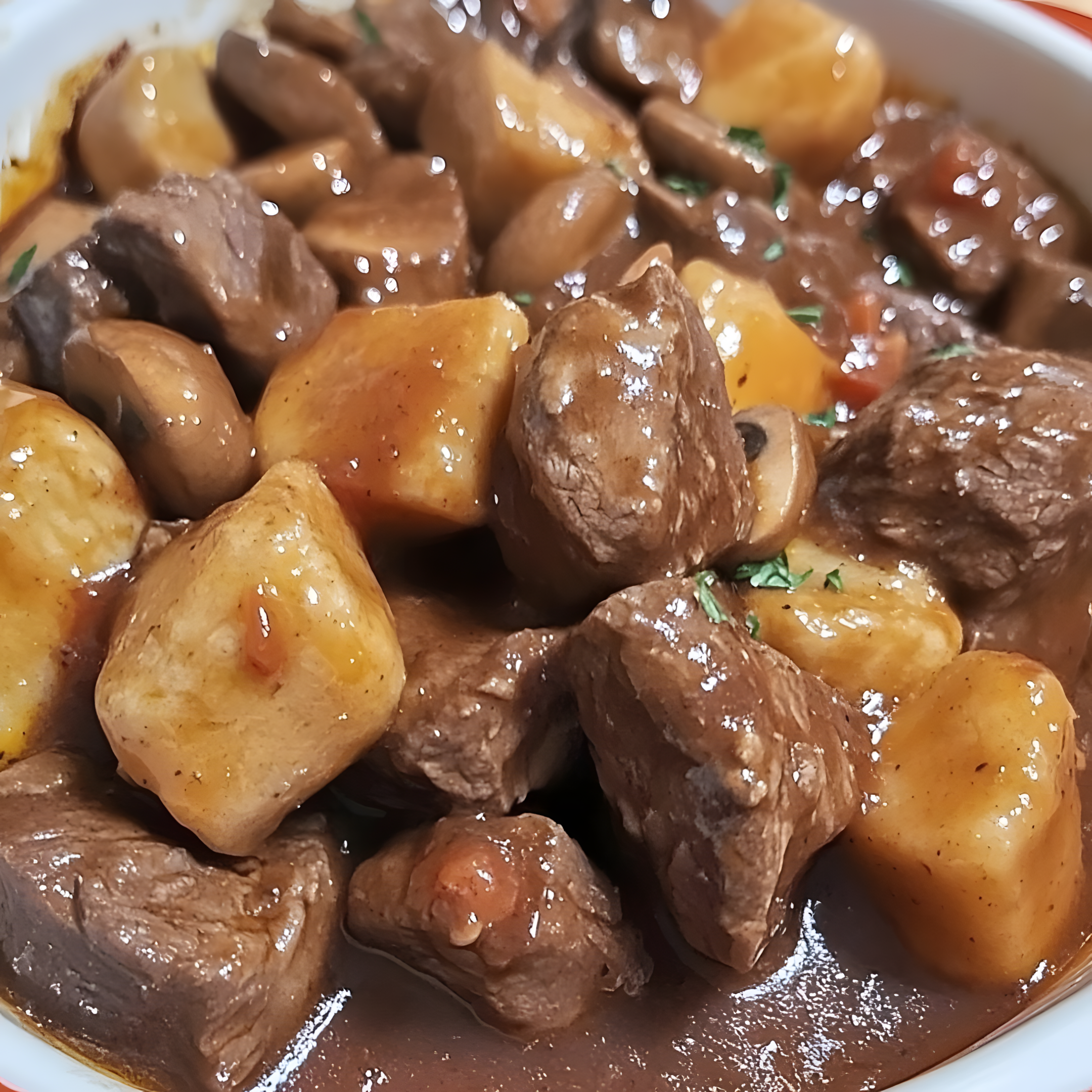 Stoofpot van rundvlees met champignons en aardappelen