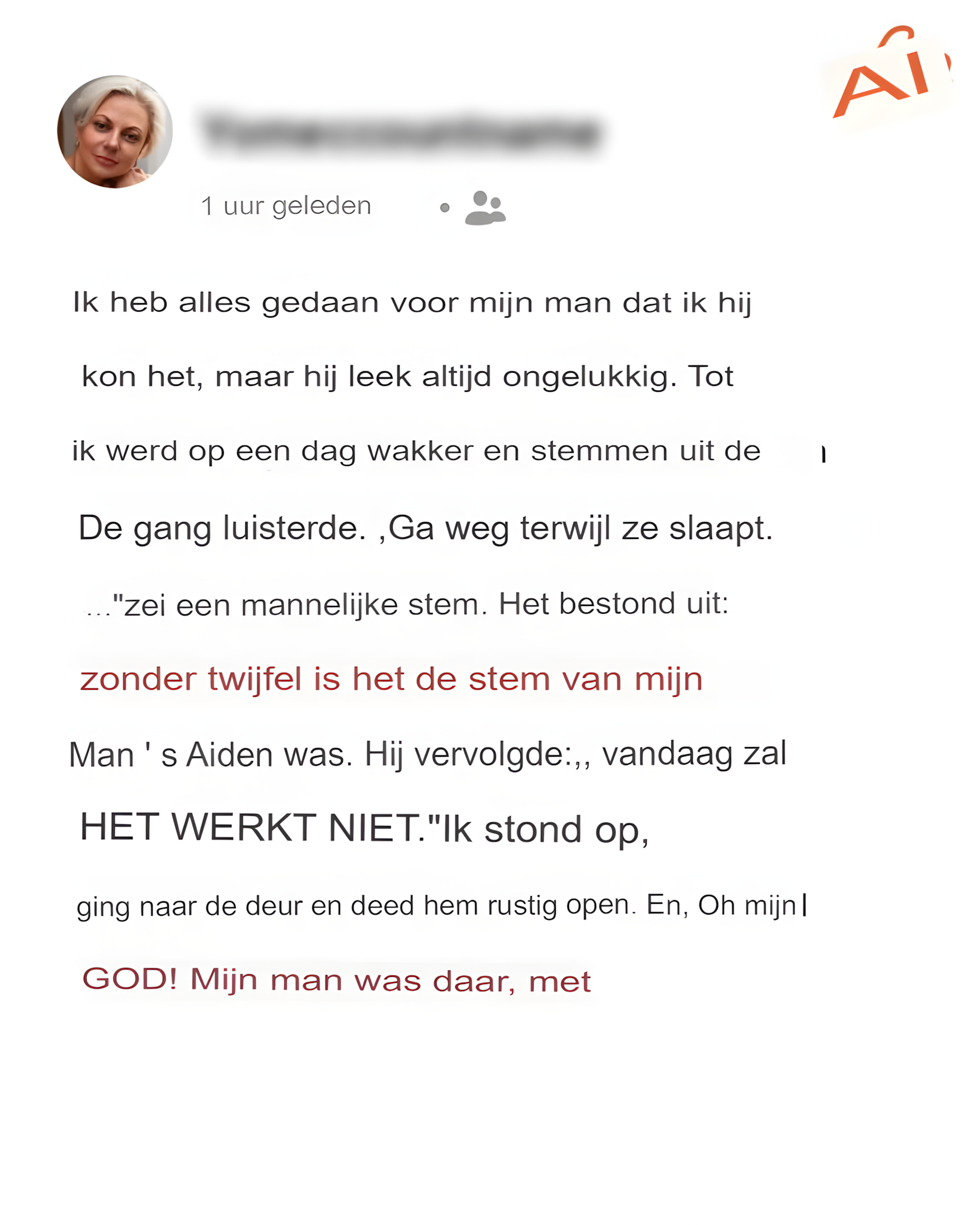 Ik deed alles wat ik kon voor mijn man, maar hij leek altijd ontevreden. Op een dag werd ik wakker en hoorde de stem van mijn man in de gang, vergezeld door een vrouwenstem. « Hoe kon hij dat? », dacht ik bij mezelf. En dat was de druppel die de emmer deed overlopen.
