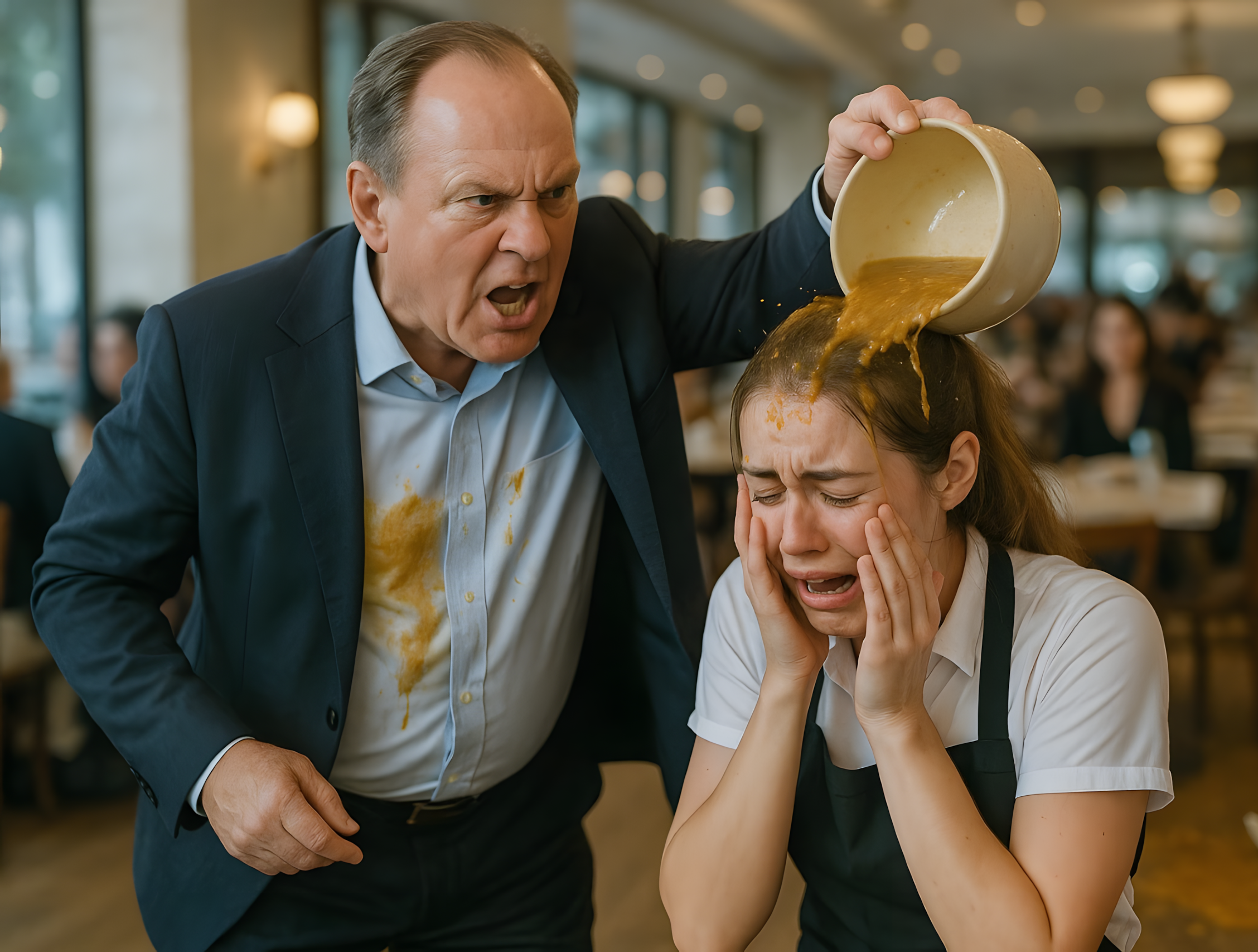« Meisje, besef je wel wat je gedaan hebt?! » riep Martin, zwaaiend met de soeplepel. « Soep op de grond, de klant is helemaal ondergedompeld, en jij staat daar alsof je bevroren bent! » Anna keek naar de donkere vlek op het dure pak van de man en voelde alles in haar krimpen. Het was het einde van haar baan. Een half jaar proberen – voor niets. Nu zou deze rijke man een ophef maken, schadevergoeding eisen, en ze zou er gewoon zonder bericht uit worden gegooid.